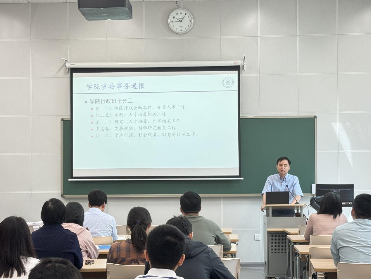 黄华院长通报学院新一任行政领导班子具体分工及内设教学机构人员的调整等情况,并作题为“任重道远,唯有奋发”的学科发展规划。黄华院长分析学院第五轮学科评估中存在的问题以及未来学科发展将面临的新形势与新局面,他强调,2023年学院实施高质量发展计划以来,取得了显著的发展成绩。随着国家教育由信息化向数字化的战略转型,计算机和人工智能学科将成为教育战略发展的核心学科,学院必须尽快补短板、冲一流。接下来五年,学院将持续在科学研究、队伍建设、人才培养、社会服务等领域中开展相关工作,主抓重点任务,实施科研质量提升工程、教师队伍质量提升工程、人才培养质量提升工程以及服务能力提升工程,实现学科水平稳步提升。