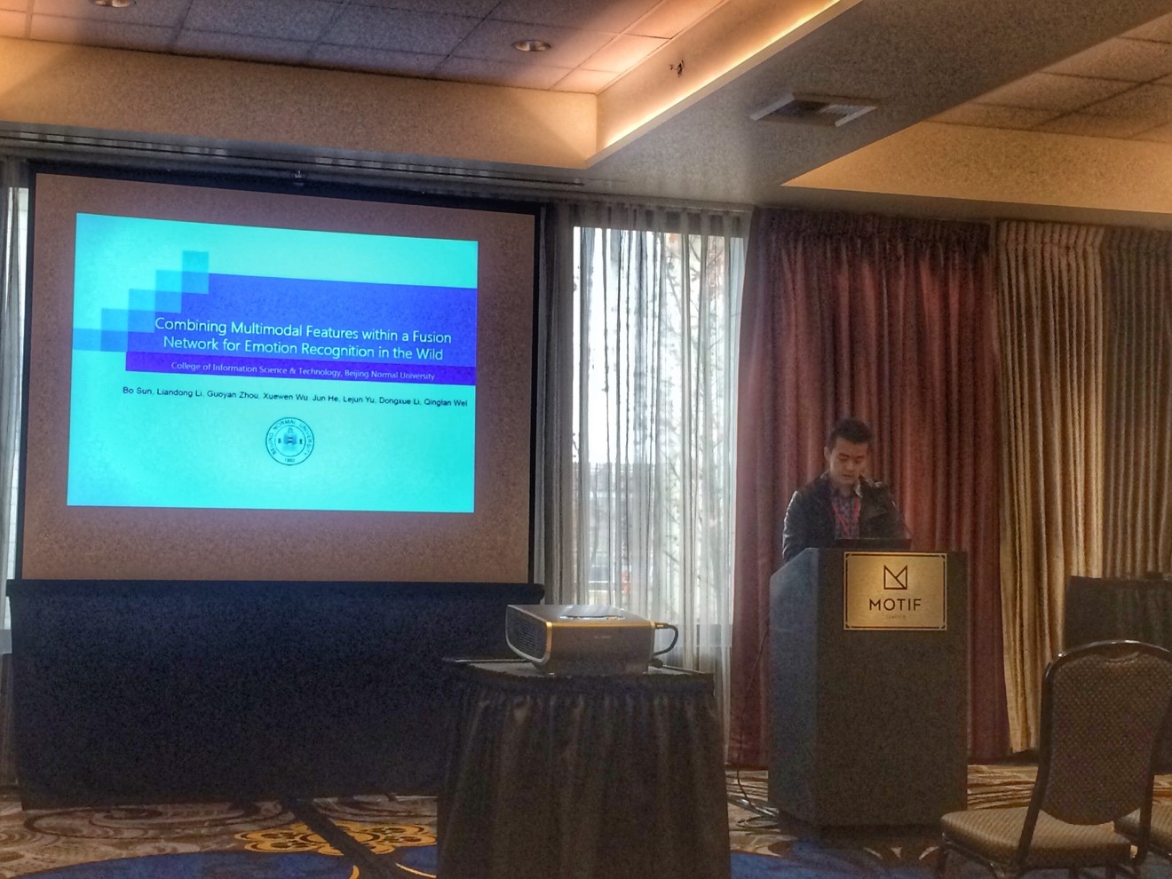 THE PAPER FOR ORAL PRESENTATION:BO SUN,LIANDONG LI,GUOYAN ZHOU, XUEWEN WU, JUN HE, LEJUN YU, DONGXUE LI, QINGLAN WEI. COMBINING MULTIMODAL FEATURES WITHIN A FUSION NETWORK FOR EMOTION RECOGNITION IN THE WILD. 17TH ACM INTERNATIONAL CONFERENCE ON MULTIMODAL INTERACTION (ICMI), PP497-502, 2015-11-9.