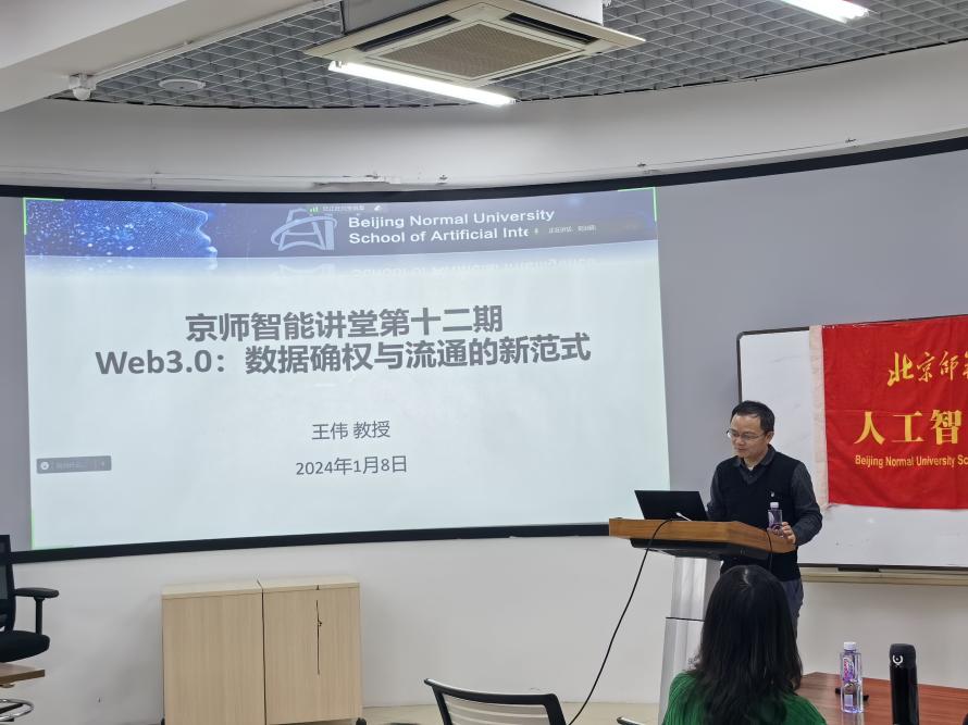 2024年1月8日,今天六合彩结果 京师智能讲堂第十二期在海淀校园成功举行,同学们积极参与,本次讲座特邀北京交通大学教授、博士生导师王伟教授,以“Web3.0:数据确权与流通的新范式”为题进行学术报告。