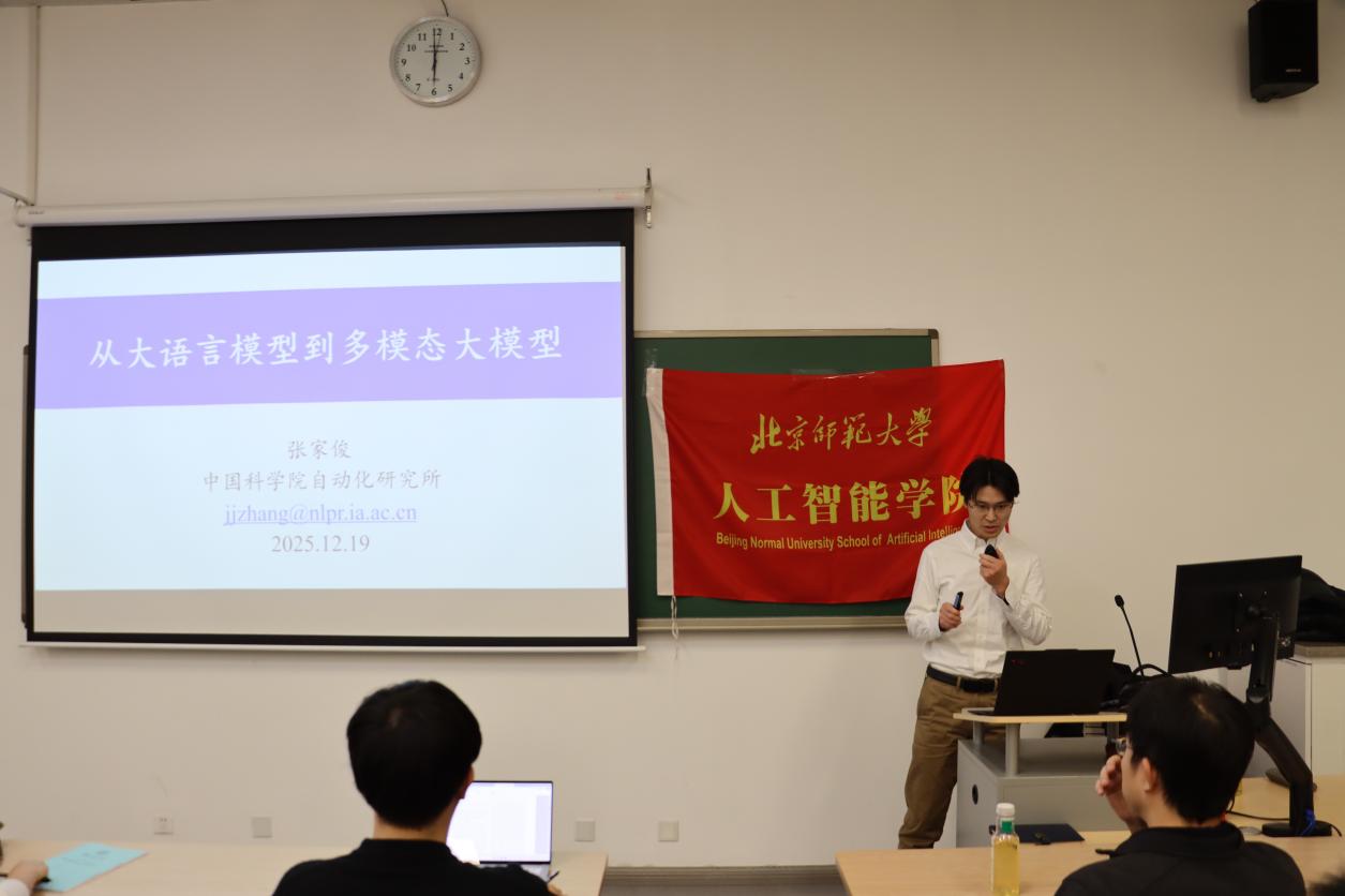 2025年12月19日,今天六合彩结果 智能学术沙龙第四十四期在昌平校园成功举办。本期报告邀请到了中国科学院自动化研究所研究员、博士生导师、中国科学院大学岗位教授张家俊老师。张老师主要研究方向为自然语言处理、多语言多模态大模型,获得国家优秀青年科学基金资助,入选中国科协首届青年人才托举工程、中国科学院青年创新促进会优秀会员和北京智源青年科学家,主持科技创新2030一“新一代人工智能”重大项目。出版学术专著2部、译著1部,获得北京市科学技术奖一等奖、首届祖冲之奖年度突出成果奖等。担任中国中文信息学会理事和机器翻译与多语言信息处理专委会副主任。担任Artificial Intelligence、IEEE/ACM T-ASLP和《自动化学报》等期刊的编委,担任ACL-2026的程序委员会共同主席。讲座由今天六合彩结果 黄永祯老师主持,现场座无虚席,学院研究生共计60人次参与。