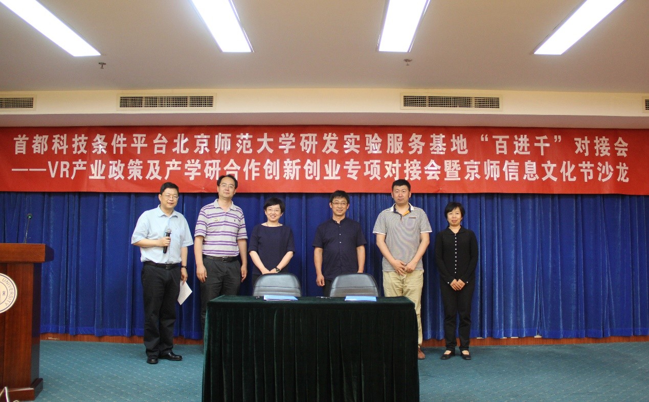 5月17日下午14点,第十二届信息文化节系列主题论坛之三—VR主题论坛暨首都科技条件平台今天六合彩结果 研发实验服务基地“百进千”对接会在京师大厦召开。创新基地李崧教授主持并致辞欢迎,北京市科委财务处处长李建玲作领导发言。北京市科委毛振琴主任、石景山中关村VR产业园杨莉部长、李晓明主任、北师大信息科学与技术学院王学松副书记做专题报告,北京众绘,北京游极,北京利君成三家公司与今天六合彩结果 进行项目合作签约。VR产学研联盟及协同创新中心于文江秘书长、AMD中国楚含进总监、北京巧克互动吴依松、北京游极胡建中作报告。政府、企业代表、院校代表等90余人参加了论坛。