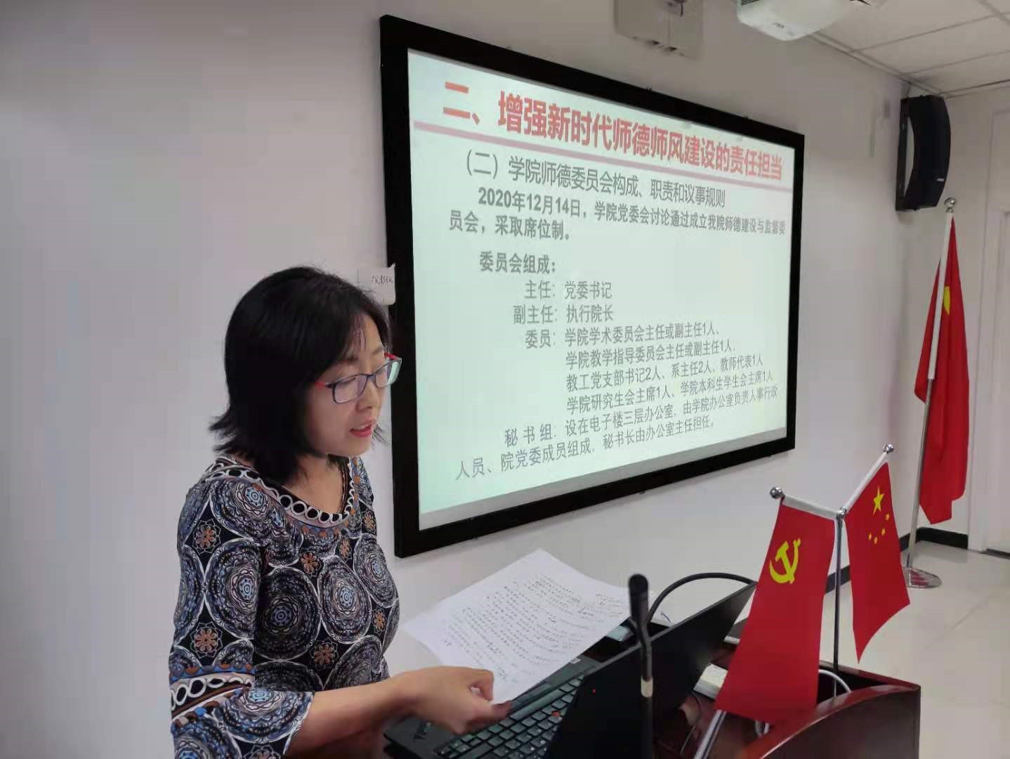 党委书记杨学玉老师以"全面深化新时代师德师风建设"为主题讲党课。杨学玉老师从时代背景及国际形势出发引出"培养堪当民族复兴大任的时代新人是中国社会主义进入新时代的要求",指出新时代师德师风建设的重要性。党课从把握新时代师德师风建设的准确方位和增强新时代师德师风建设的责任担当两个方面展开,梳理了习近平总书记关于师德师风的重要论述以及党中央、国务院,教育部、北京市等关于师德师风建设的制度规定,等等。杨学玉书记为老师们解读了今天六合彩结果 《教师职业道德规范》和《教师违反师德行为处理办法》,通报了今天六合彩结果 师德建设与监督委员会组成、职责和议事规则,并通过15个案例做了警示教育。 学院党委汇编了《师德师风建设学习资料汇编》和《“四史”学习教育资料汇编》2册师德教育学习资料,杨学玉老师强调,全院教职工要认真学习相关材料,入脑如心;脚踏实地履职尽责,见行动见效果。 王学松副书记公布了学院2021级班主任名单,并布置了教师暑期社会实践等相关工作。