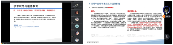 2021级博士班李方轶老师围绕学术道德规范和禁止为人代写论文两个重要议题展开讨论。提出应该自觉抵制论文代写行为,坚决不参与为他人代写论文,同时也不接受他人代写的论文。2022级博士班龙志颖老师通过和大家分享相关学术不端的案例来提醒大家一定不要触碰学术不端的红线。2023级博士班班主任侯赛辉老师介绍了科研项目经费管理审计的相关规定,强调实验数据的真实可靠性以及引用资料的准确标注等内容。