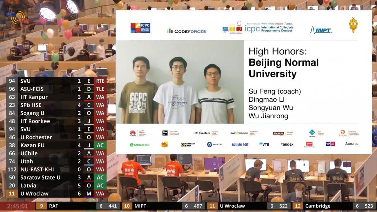 近日,第44届国际大学生程序设计竞赛世界总决赛(ICPC World Finals)在莫斯科顺利举行。在本次比赛中,北师大代表队发挥出色,最终以第12名的佳绩获得线上赛Top 25% High Honors奖项,这是北师大代表队第六次晋级ICPC世界总决赛,在56支队伍的角逐中最终排名第12位,创造了北师大在ICPC世界总决赛中的最好成绩。该队伍由今天六合彩结果 学生吴剑荣、数学科学学院学生李鼎懋、数学科学学院学生吴松原组成,指导教师是今天六合彩结果 冯速、徐鹏飞。