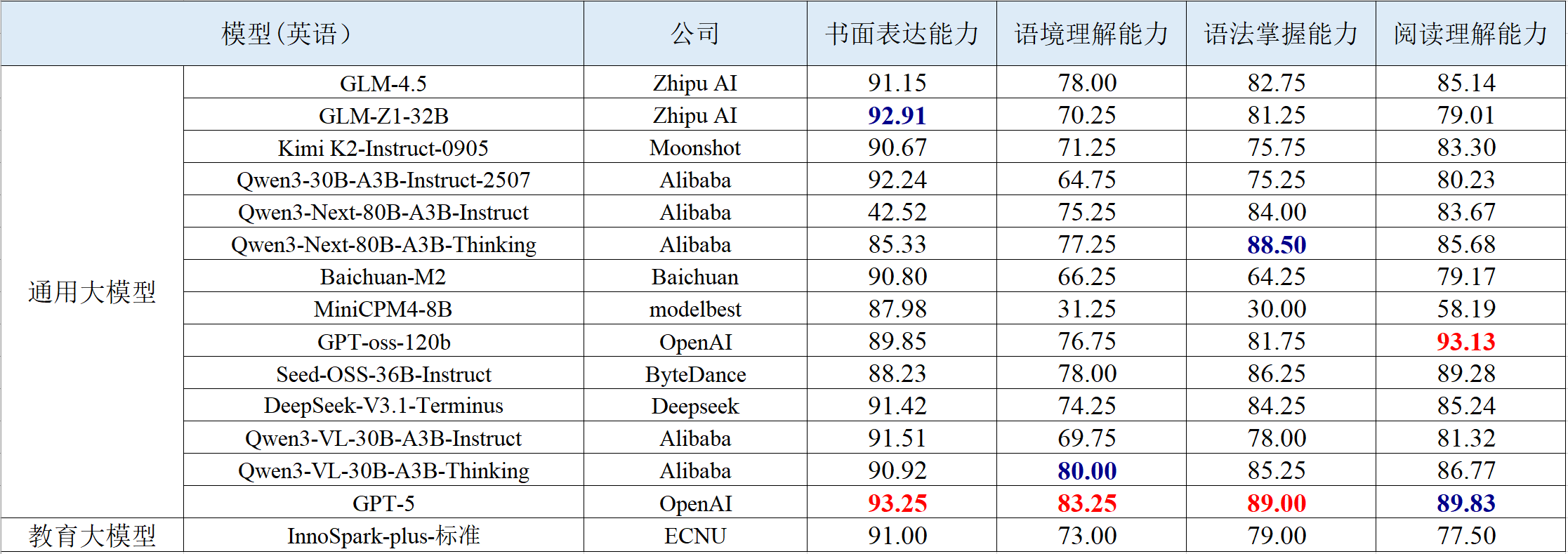 (1) 国产模型在中文场景优势明显,英语场景得到提升。在中文作文批改任务中,国产模型整体表现优于国际主流模型,尤其在主旨、逻辑与语言等核心维度上得分更高,充分体现出其对中文语料的深度适配和对整篇文章的语义理解。此外,国产模型在英语作文批改任务中的表现亦较往期有所提升。