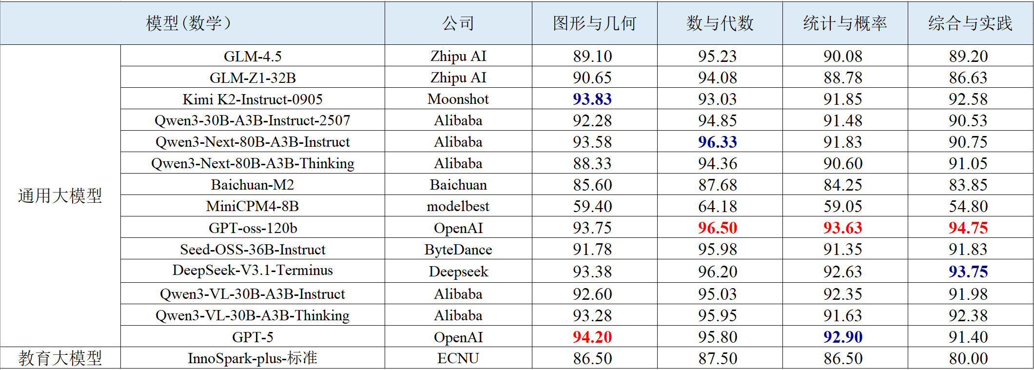 教育专业能力聚焦初中解题场景,覆盖语文、数学、英语、物理、化学、生物、历史、地理、信息科技 9 大核心学科,包含客观题和主观题,依据新课标课程内容制定每门学科的细粒度评测维度。评测结果如下表所示。