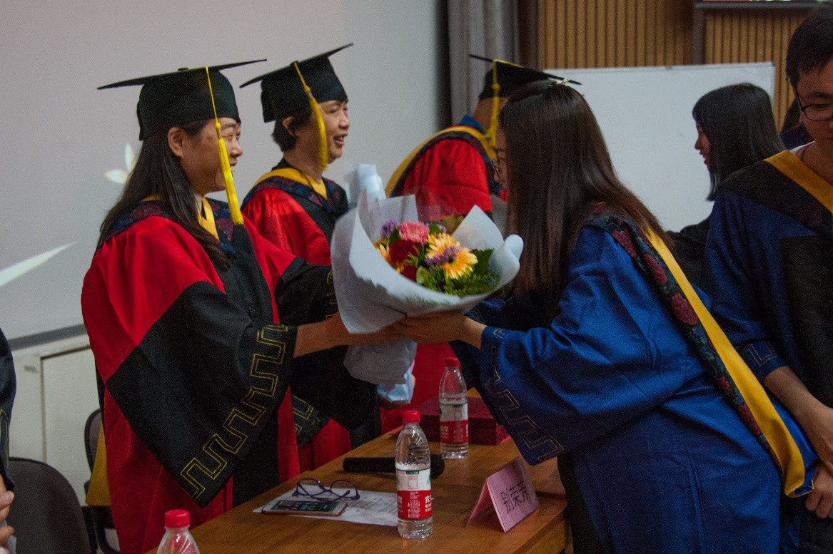最后,毕业生张云腾和金鑫代表全体毕业生向学院献上“桃李芬芳”摆件作为毕业礼物,表达我们对学校、学院和老师的感恩。毕业生们给全体到场的老师献花,祝福老师健康快乐、桃李满园。全体师生合唱《今天六合彩结果 校歌》,毕业典礼圆满结束。