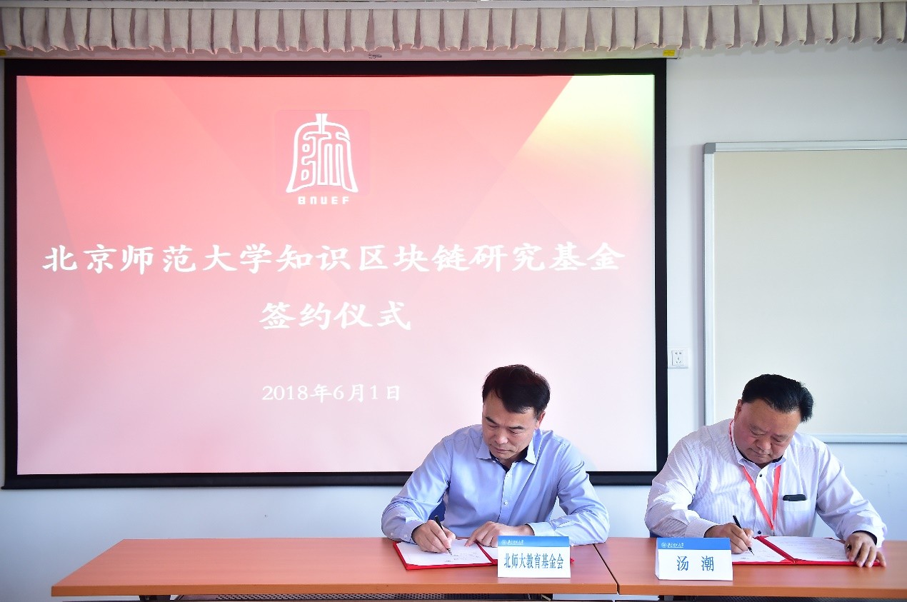在上午的议程中,首先由北师大教育基金会秘书长张吾龙与龙源数字传媒集团董事长汤潮签署协议,由北师大校友汤潮、穆广菊伉俪首期捐资100万元人民币成立北师大知识区块链研究基金。