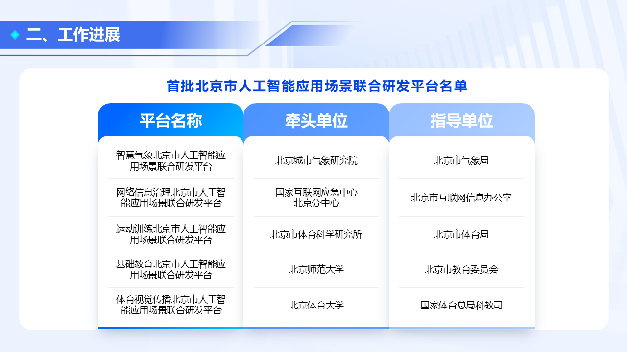 北京市科委、中关村管委会于今年4月启动北京市人工智能应用场景联合研发平台的储备工作。经过专家评审凝练,从近300家行业用户的申报中评选出首批10余家联合研发平台,涵盖政务、教育、智慧城市、文化体育、工业、金融等重点行业。